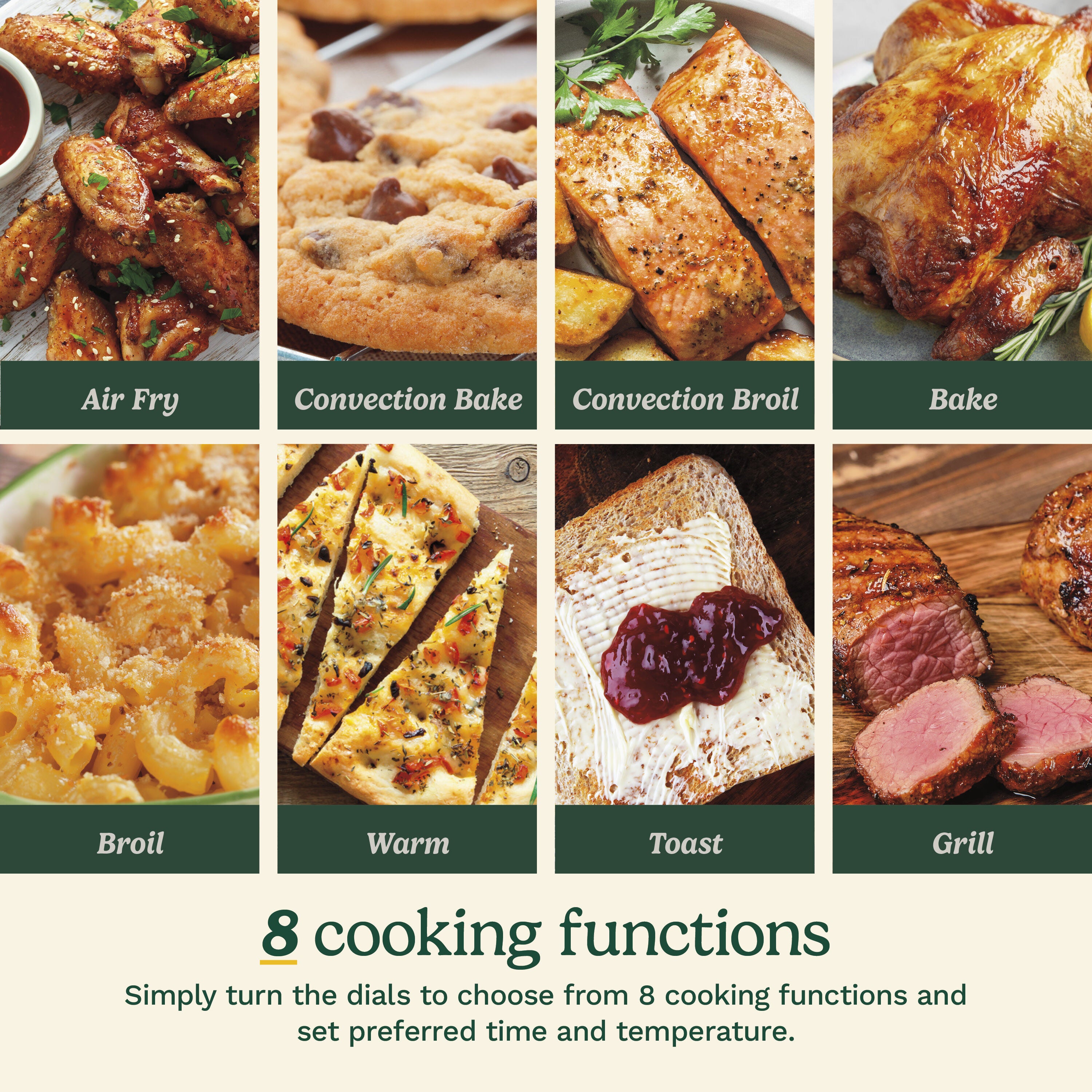 - 8 Functions Include: Air Fry, Convection Bake, Convection Broil, Bake, Broil, Warm, Toast and Grill