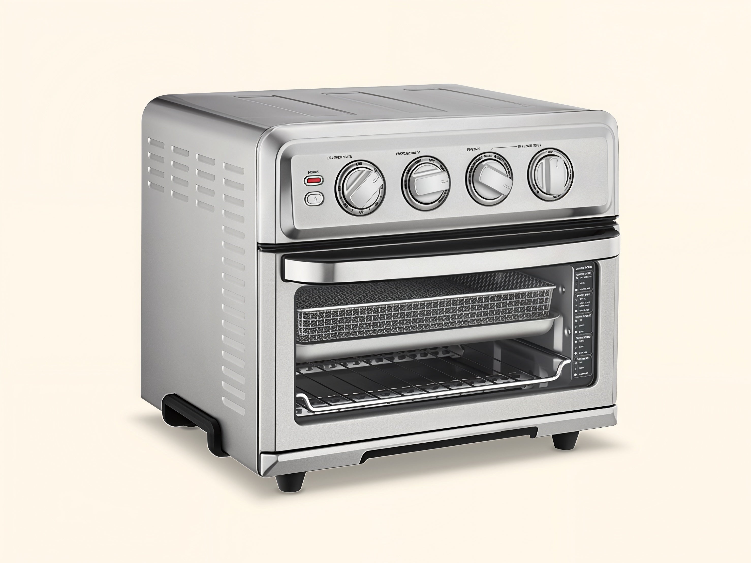 - Includes: Rack, baking pan/drip tray, air fry basket, reversible ceramic grill/griddle, stainless steel interior.